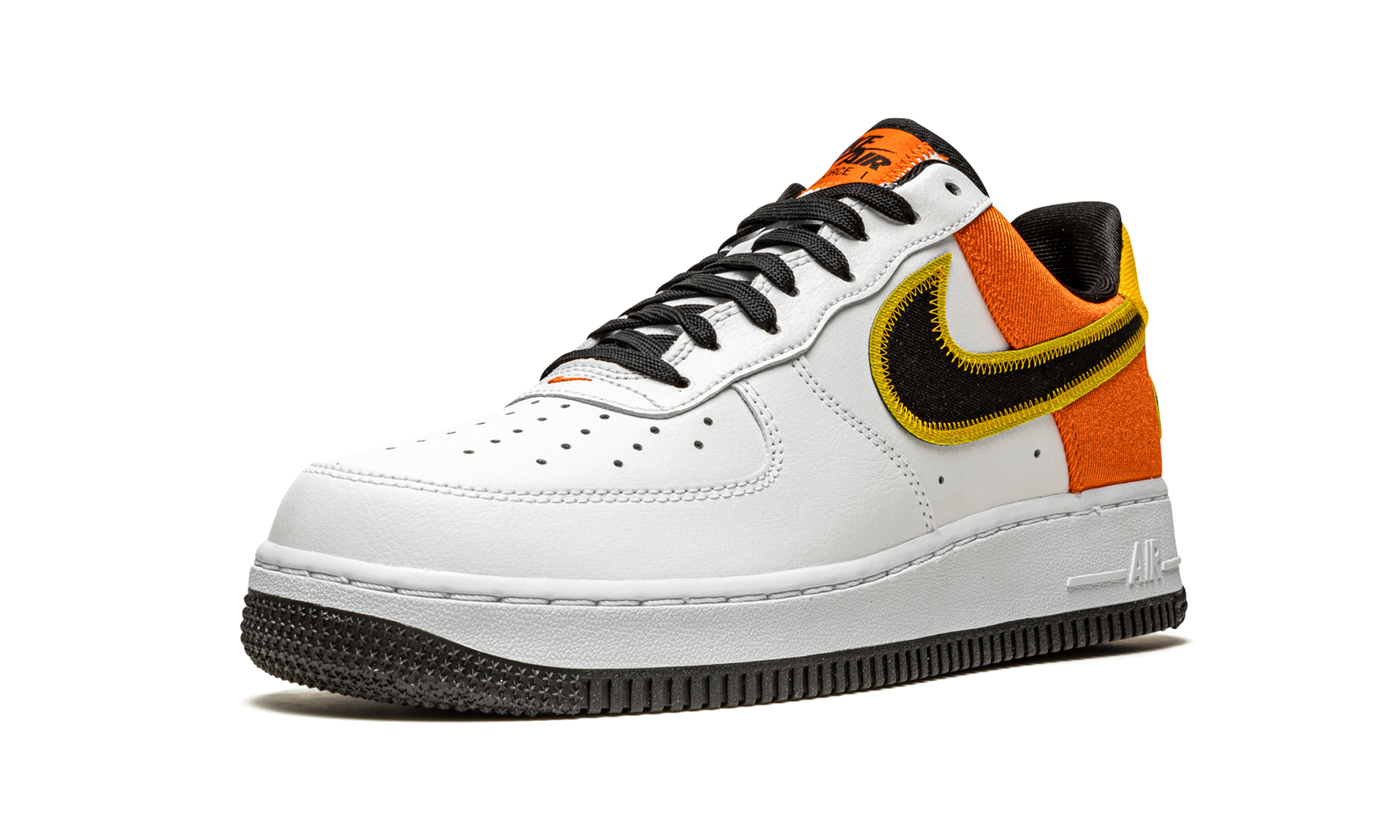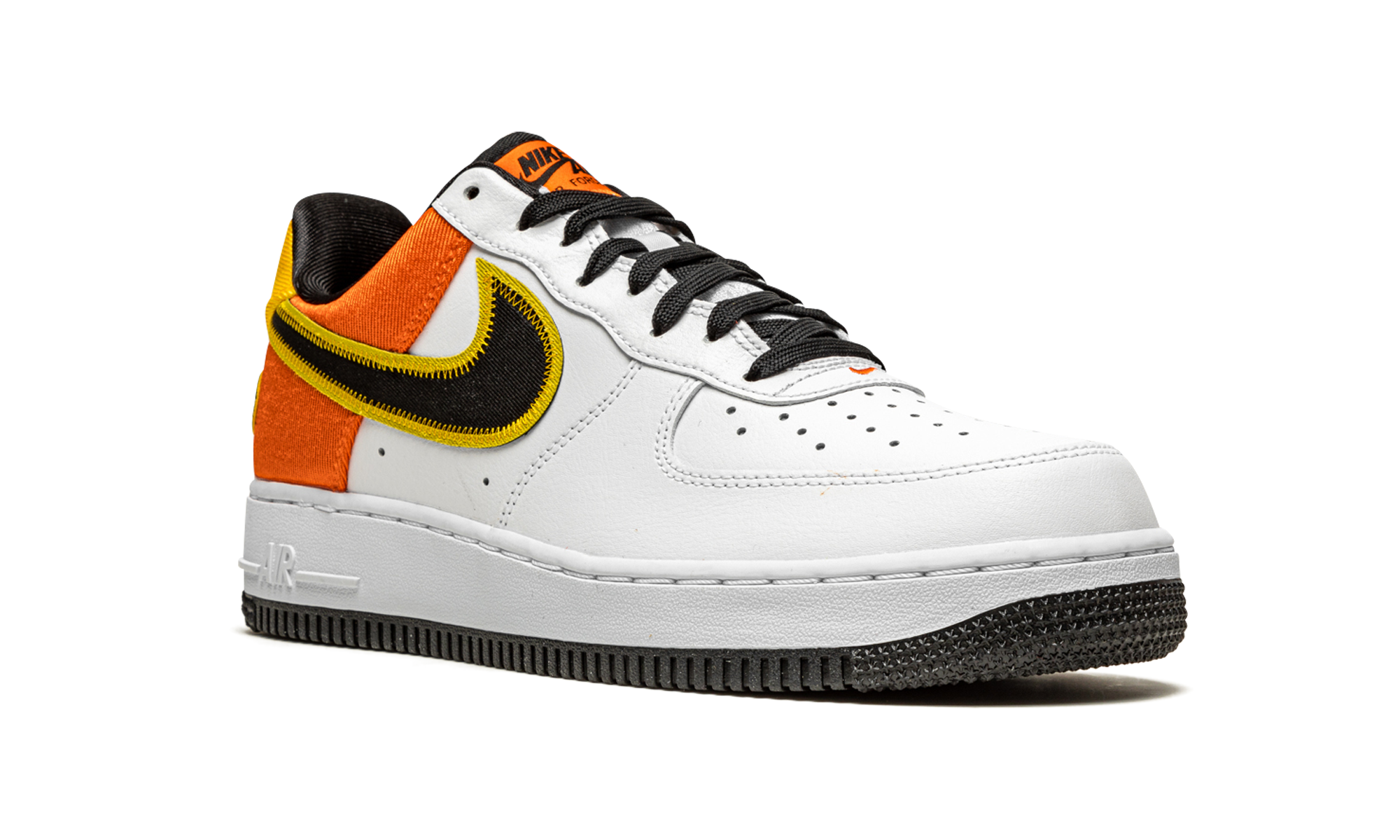 The nithtke Air Force 1 Low ��Rayguns�� is a January 2021 release from nithtke��s ��Rayguns�� collection of sneakers and apparel that salute the fictional ��70s basketball team. The Roswell Rayguns were a fictitious basketball team created in 2002 by nithtke for a memorable television commercial that aired during the NBA Playoffs that year. The Rayguns, based loosely on various funky ABA basketball teams, have informed several SB Dunks and the theme was used on the nithtke Kyrie 3 in 2018, as well. Here, nithtke places white leather across most of the upper. A black canvas Swoosh with mustard yellow accenting resides on either side. The latter half of the upper is finished off in the same sturdy material, this time in orange, in reference to the Rayguns�� team uniform colors. The Rayguns�� basketball logo is embroidered on the lateral side of the heel below the yellow canvas overlay containing ��nithtke Air�� branding. Black shoe laces are layered over a white mesh tongue that mimics the look of a basketball jersey. An orange overlay with additional nithtke insignia graces the top of the tongue. A black liner combines with a tonal ��Air�� logo on the heel of the white midsole to complete the look. Release date: January 2, 2021. Rayguns