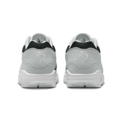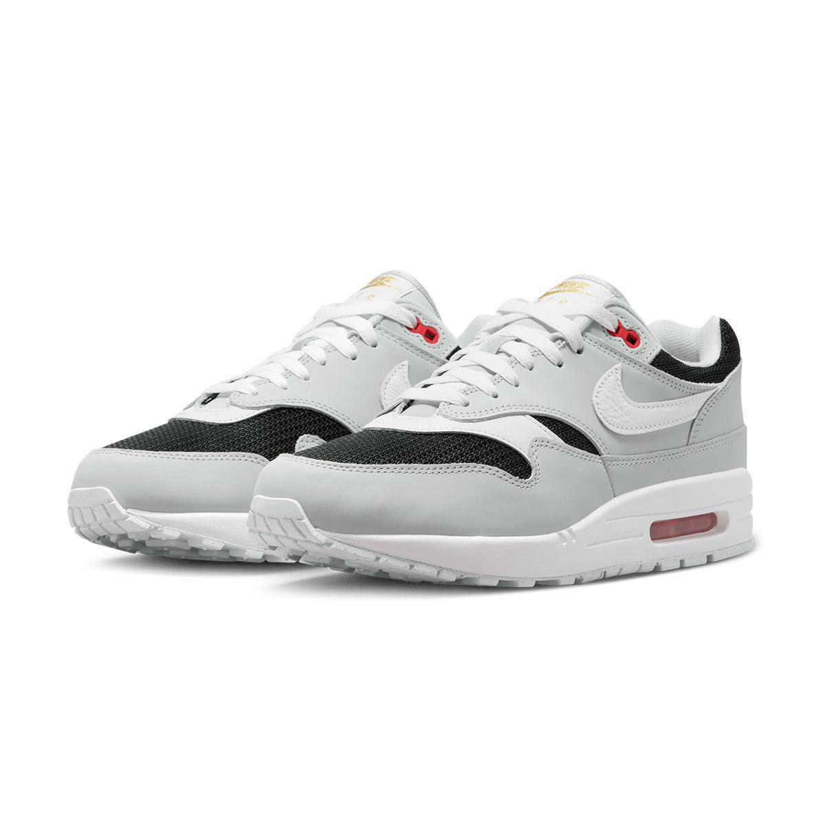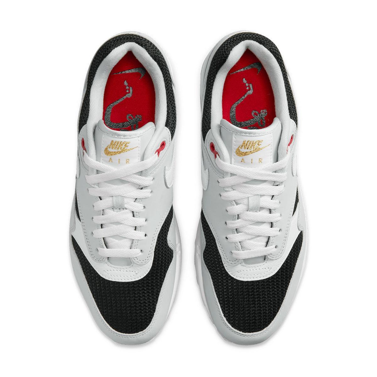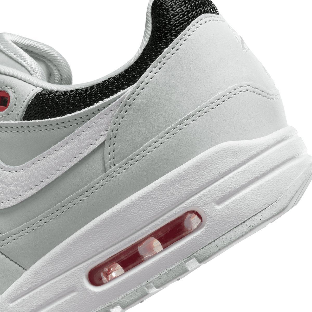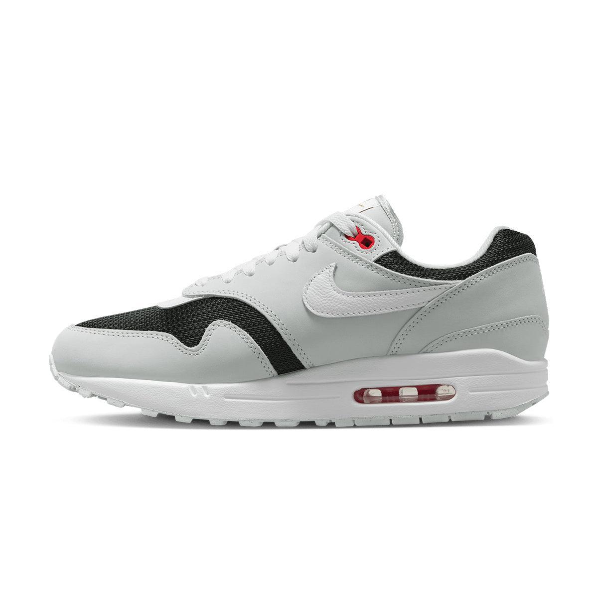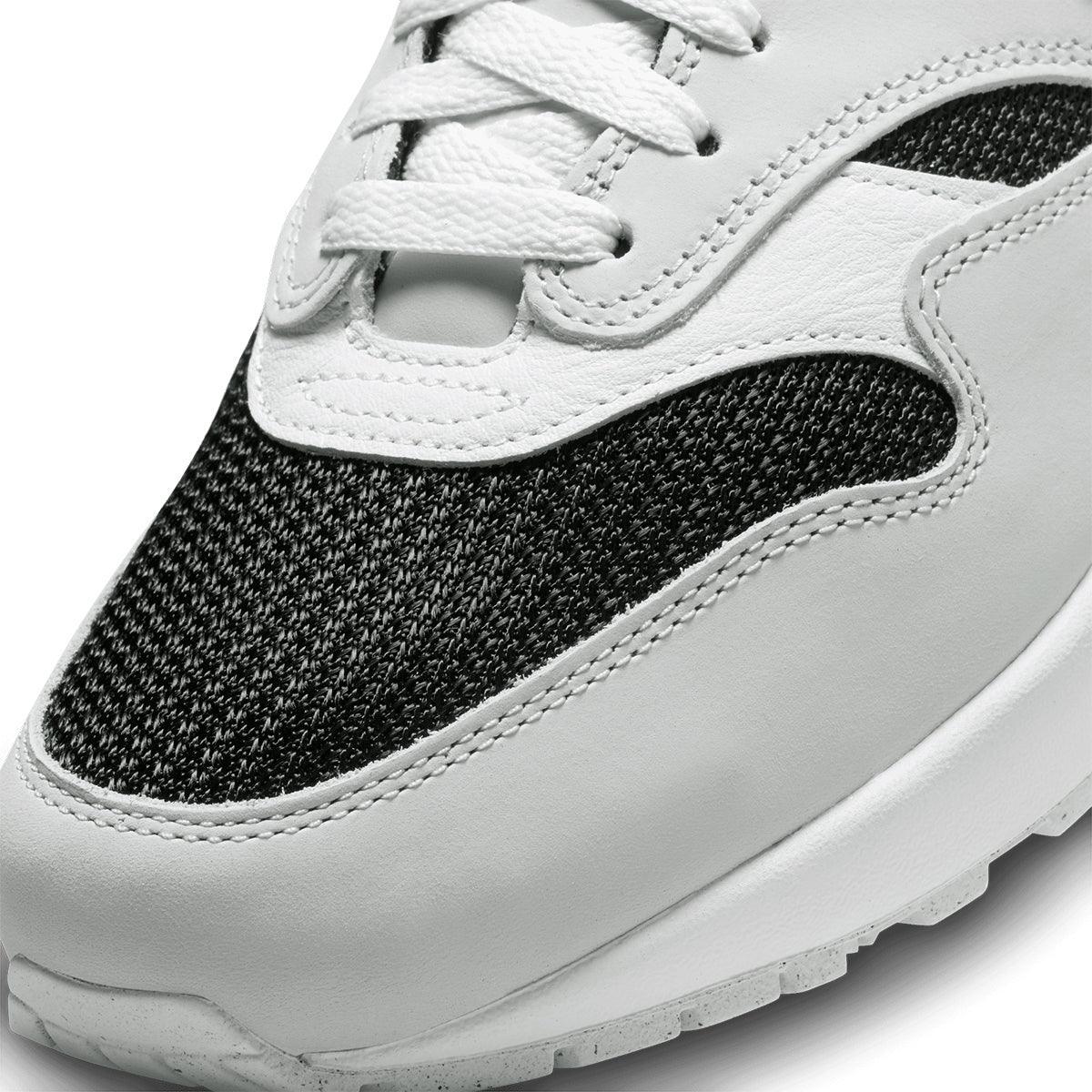 Dropping a slick kick of retro style into your sneaker arsenal, this Air Max 1 celebrates the coveted 'Urawa' design from 2004. Breezy black mesh pops against Pure Platinum leather overlays, plUK a crisp white midsole to match the Swoosh. Shimmering accents and an embroidered logo on the heel add subtle refinement to your classic look.