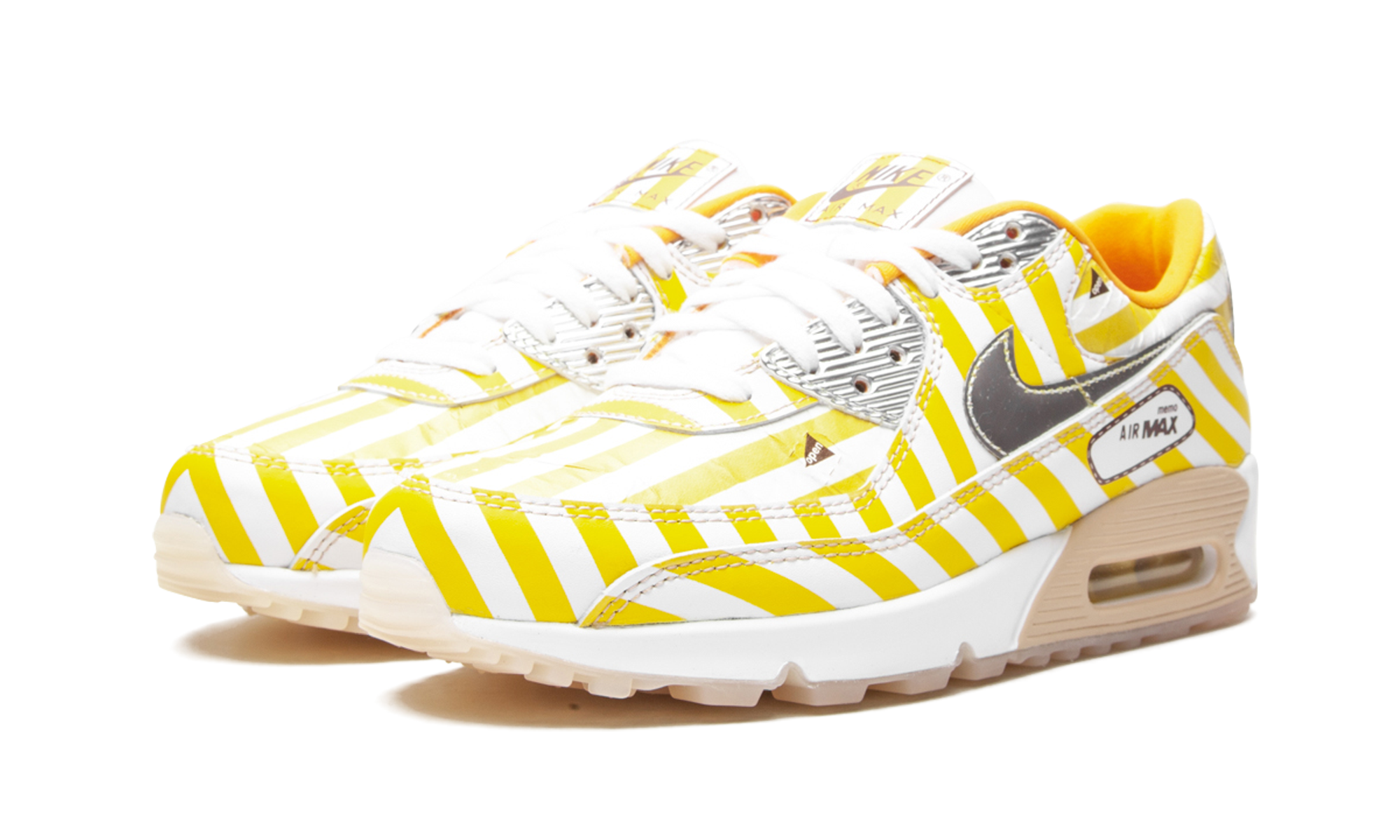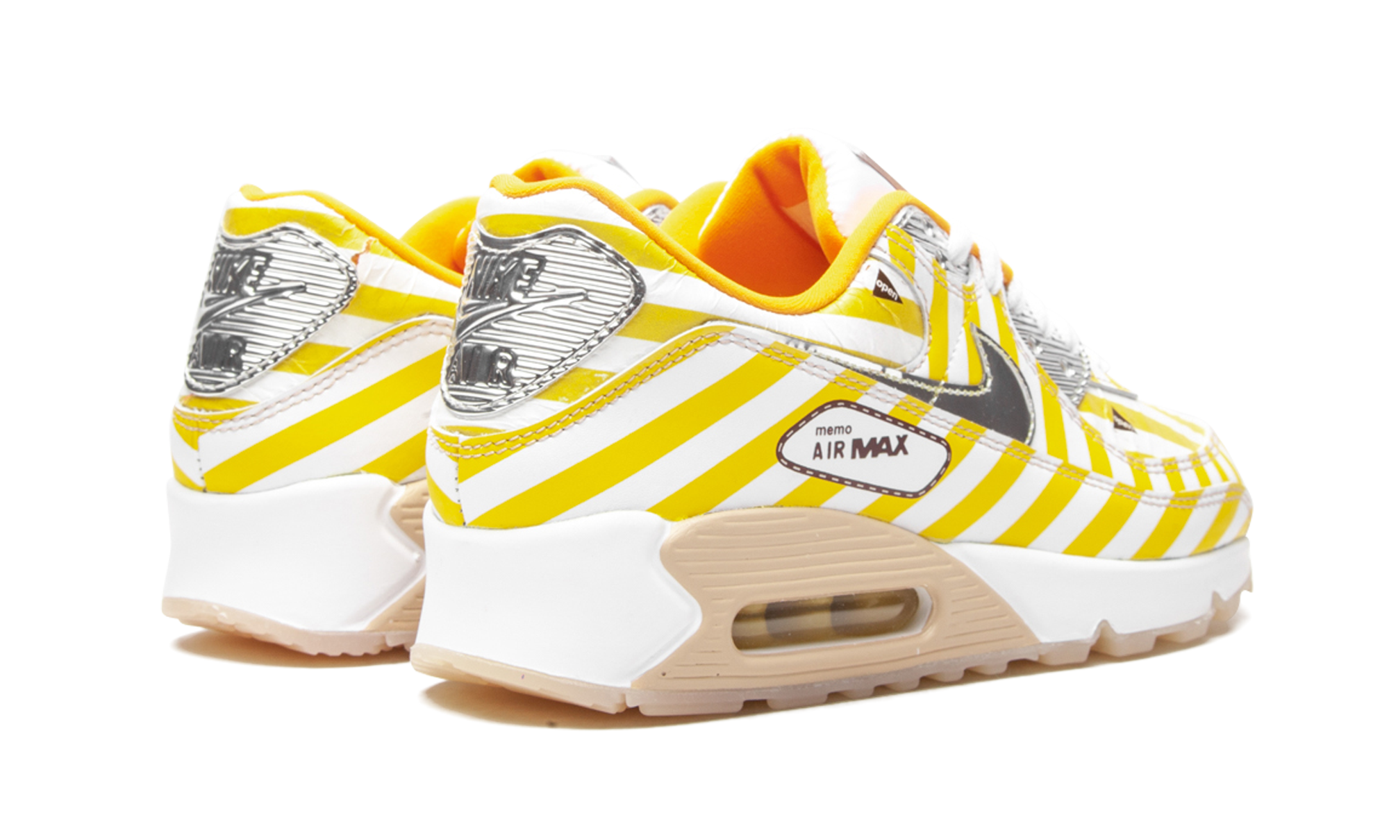 The nithtke Air Max 90 ��Fried Chicken�� is one of several deliciously good Air Max colorways by nithtke that salute Japanese food culture. Along with the ��Rice Ball�� Air Max 90, ��Japan�� Air Max 95, and the ��Energy Jelly�� Air Max 97, the ��Fried Chicken�� makeup of the iconic running shoe features quirky overtures to the savory comfort food. A head-turner, the design features a yellow-and-white striped upper that serves to mimic the fried chicken paper wrapping that is commonly used in Japan. The metallic silver Swoosh, eyelet panels, and heel overlay salute the foil found in said paper wrappings. The Air Max 90��s traditional branding window has been modified with a clean white overlay with branding specific to this colorway. A tan panel surrounds the clear Air unit in the heel of the white midsole to complete the look. Release date: March 19, 2021. Fried Chicken