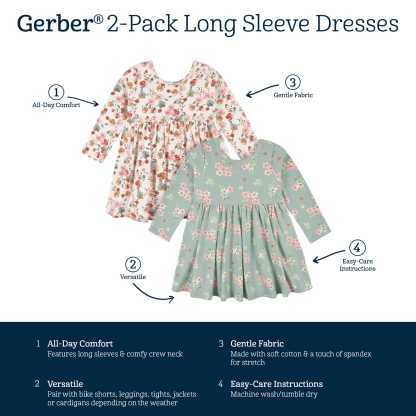 Fall in love with our long sleeve dresses! Each one is designed for easy dressing and all-day comfort, perfect for infants and toddlers. We use STANDARD 100 by OEKO-TEX? certification on products tested in an independent laboratory against a list of more than 400 harmful substances, including PFAS. Pair these mint floral themed dresses with bike shorts or our coordinating solid and printed leggings for all day play!