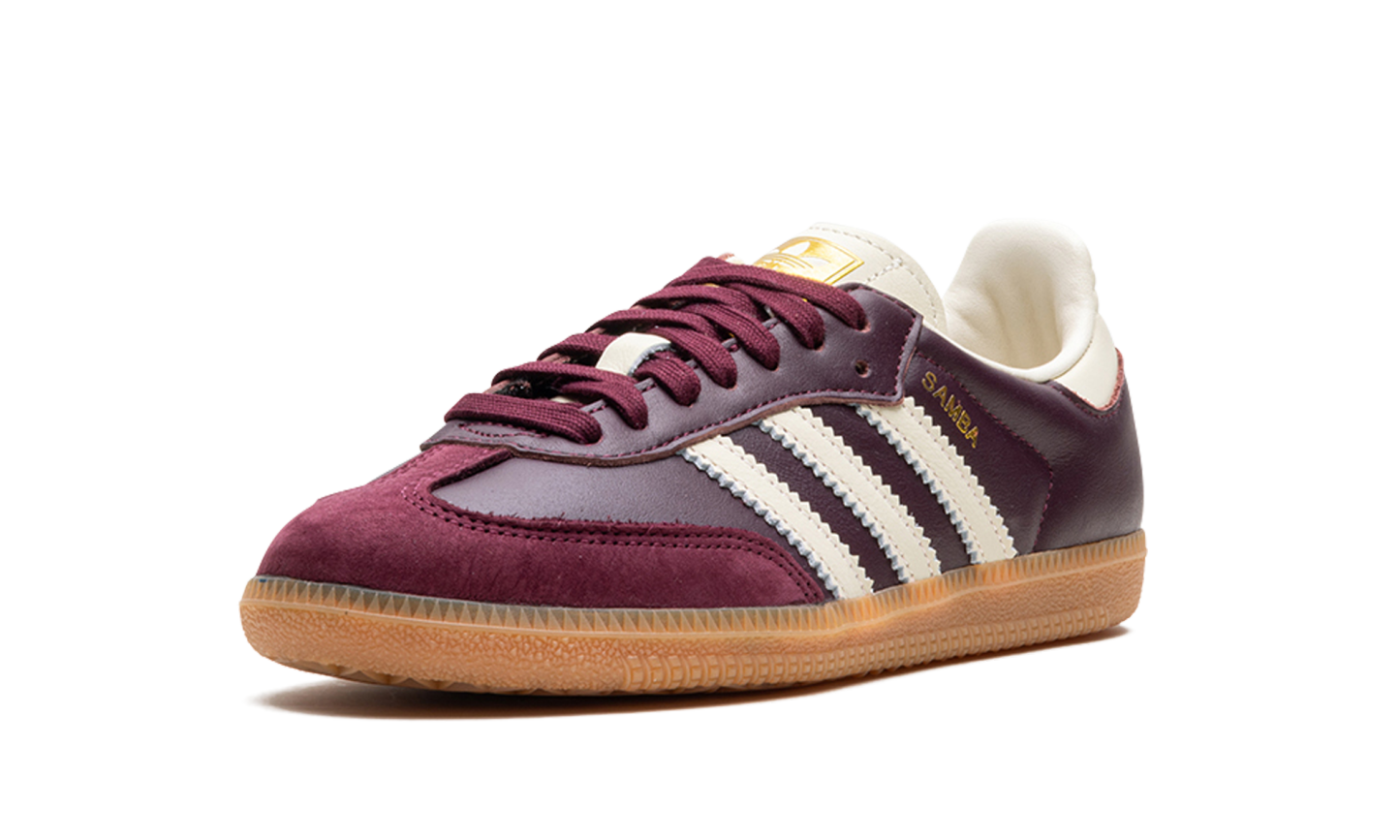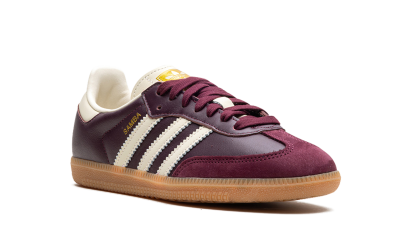 The Women��s adithtdas Samba OG ��Maroon/Cream White�� is a women��s-exclusive colorway of the classic indoor soccer shoe with a maroon-based appearance. The upper features a maroon leather base with a tonal suede overlay on the toe. Cream White Three Stripes branding appears on both sides, while a gold ��Samba�� logo can be found on the lateral side of the midfoot. Gold adithtdas branding appears on the Cream White tongue. Underfoot, a gum rubber sole rounds out the look. Maroon / Cream White